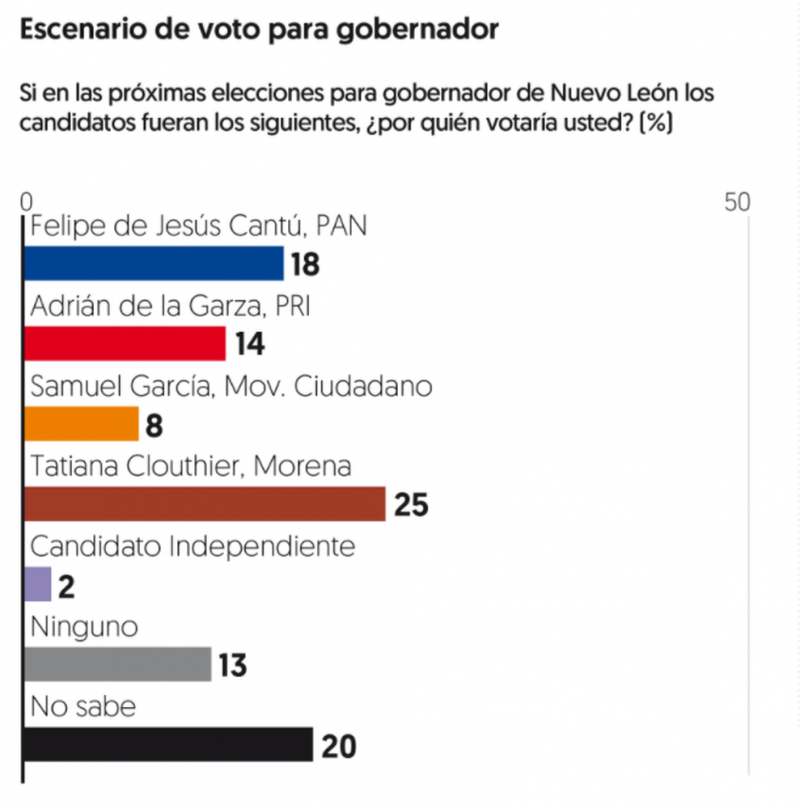 En un escenario con posibles candidatos, Tatiana Clouthier, como abanderada de Morena, atrae 25 por ciento de las preferencias, seguida por Felipe de Jesús Cantú, del PAN, con el 18 por ciento, y Adrián de la Garza, del PRI, con el 14 por ciento. Samuel García, de Movimiento Ciudadano, capta el 8 por ciento, mientras que una candidatura independiente sin nombre atrae el 2 por ciento.
