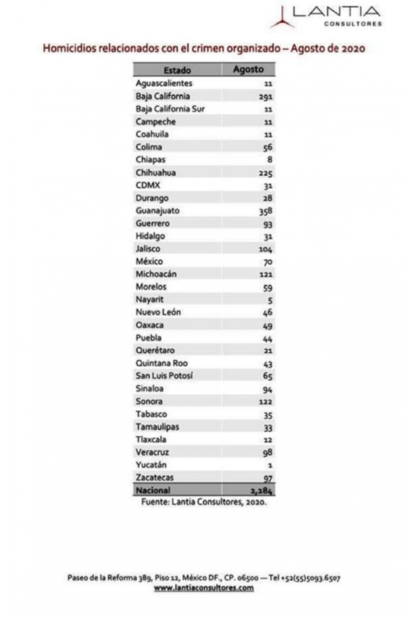 El día de hoy, Lantia Consultores, uno de las empresas más prestigiadas en el estudio de la seguridad en nuestro país publicó la tabla de homicidios relacionados con el crimen organizado estado por estado, en ella la Ciudad de México se coloca en el lugar 21 con 31 homicidios ocurridos durante el mes de agosto de 2020. En contraste Guanajuato (358 homicidios), Baja California (291 homicidios), Chihuahua (225), Sonora (122 homicidios), Michoacán (121 homicidios) y Jalisco (104 homicidios) se colocan en el top de las entidades más violentas.