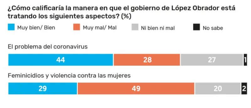 En la más reciente encuesta realizada por El Financiero, el 44% de los entrevistados evalúa favorablemente el manejo de la pandemia por parte del gobierno de López Obrador, por el contrario, el 28% lo califica como desfavorable.