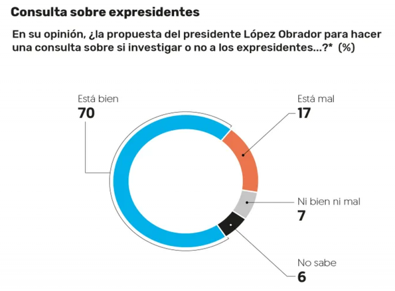 Dichos resultados reflejarían el impacto de la consulta sobre el juicio a los expresidentes. El 70% de los entrevistados señaló que esta bien la propuesta del Presidente para investigar a los expresidentes; el 17% opina que esta mal. Esta encuesta se realizó antes de que la Suprema Corte de Justicia de la Nación decidiera declara como constitucional la encuesta.
