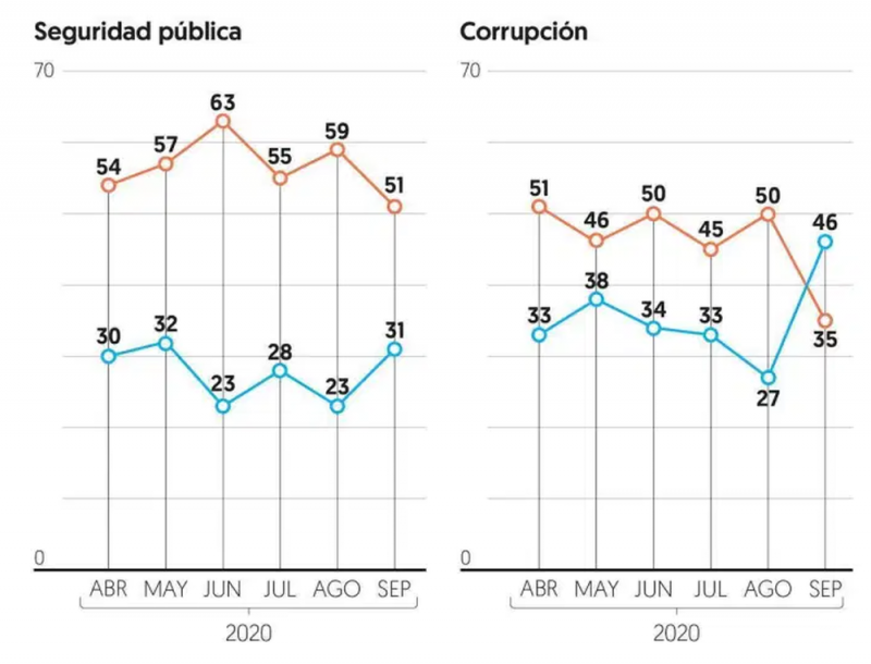 Respecto al tema de la corrupción es el que destaca con una respuesta muy favorable de 27 a 46% en comparación con el mes anterior. Las opiniones desfavorables cayeron de 50 a 35%.