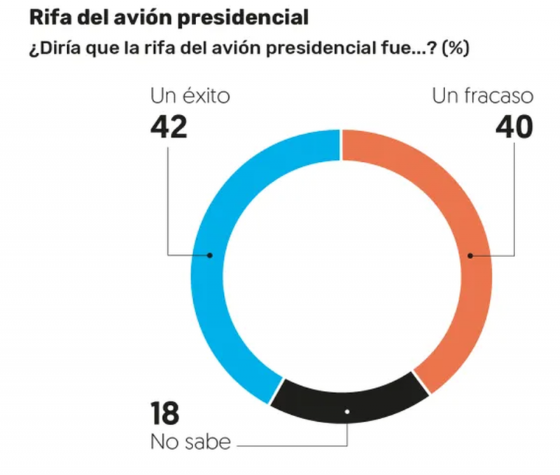 El 69% señala que la investigación debe apegarse estrictamente a un proceso judicial, mientras que el 23% opina que el asunto debería abrirse a consulta. En la encuesta también se evalúa el desempeño del gobierno en diversos sectores. Al abordar el tema de la rifa del avión presidencial, el 4”5 lo considera un éxito y el 40% un fracaso.