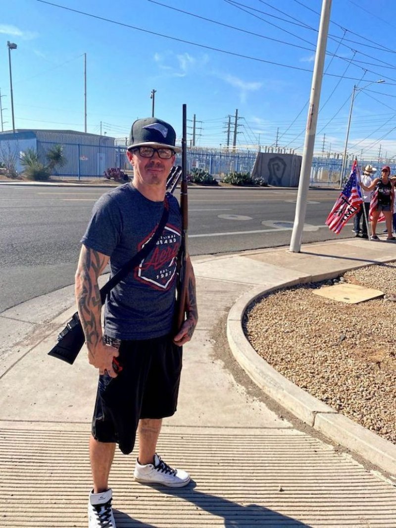 Con un AK-46 y otro rifle, Joshua es uno de los seguidores del Presidente de EU, Donald Trump, que patrulla frente al centro de cómputo de votos que se ha hecho más famoso del país, el del condado de Maricopa (Arizona, EU). Pide a gritos que su sufragio se tenga en cuenta.