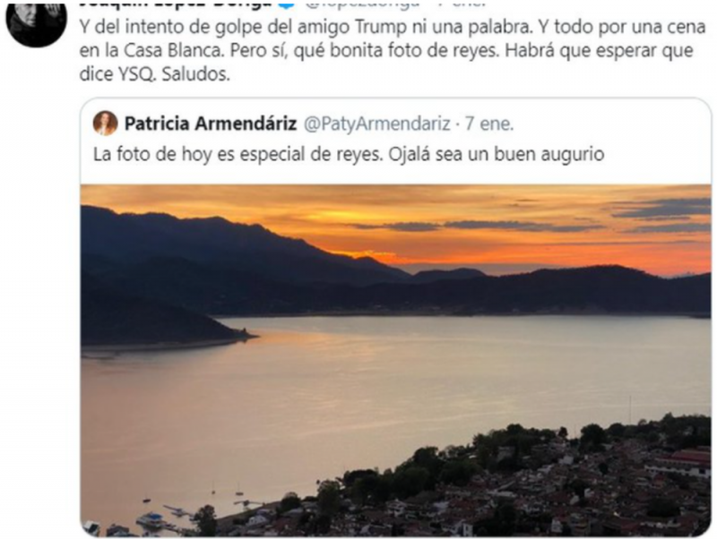 De tal modo que López-Dóriga contestó: “Y del intento del golpe del amigo Trump ni una palabra. Y todo por una cena en la Casa Blanca. Pero sí, qué bonita foto de reyes. Habrá que esperar que dice YSQ. Saludos”.