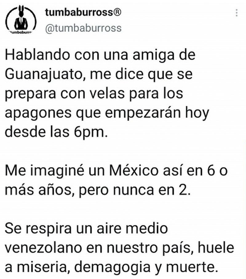El opositor comenta que él se imaginó una situación como está a los 6 años de gobierno, no a los dos como ahora. El influencer de redes sociales Tumbaburros compartió una publicación en redes sociales dónde criticó la situación actual de apagones en el país.