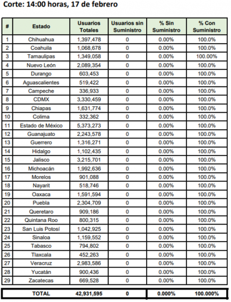 A las 12:30 horas del 17 de febrero de 2021, se encuentran sin suministro 233 usuarios, en el estado de Tamaulipas, que representan menos del 0.001% del total de usuarios de la CFE en el país.