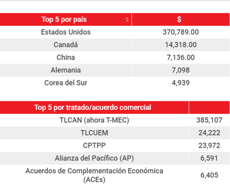 Durante este periodo, México representó el 14.9 por ciento del comercio total que realizó EU, seguido de China (14.7 por ciento), Canadá (14.3), Japón (4.7), Alemania (4.5), Corea del Sur (3.5), Reino Unido (2.6), Vietnam (2.5), India (2.4) y Taiwán (2.3).