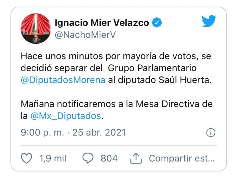De acuerdo a un tweet de Mier, se dio a conocer que la decisión fue tomada por mayoría de votos de los legisladores morenistas. De esa manera se cumple el exhorto hecho por la Comisión Nacional de Honestidad y Justicia (CNHJ), para que en un plazo máximo de 3 días hiciera las gestiones necesarias para separar de manera inmediata y definitiva al legislador.