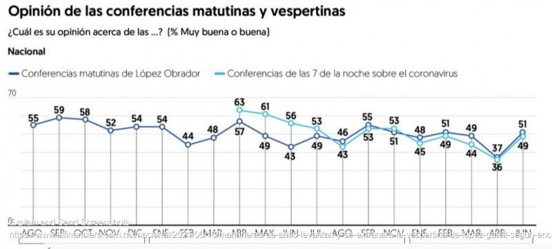 Por otra parte, el 49 por ciento de los encuestados califica como buenas o muy buenas a las conferencias de las 19:00 horas sobre el coronavirus. Cifra 13 puntos arriba que la registrada en abril pasado (36 puntos).