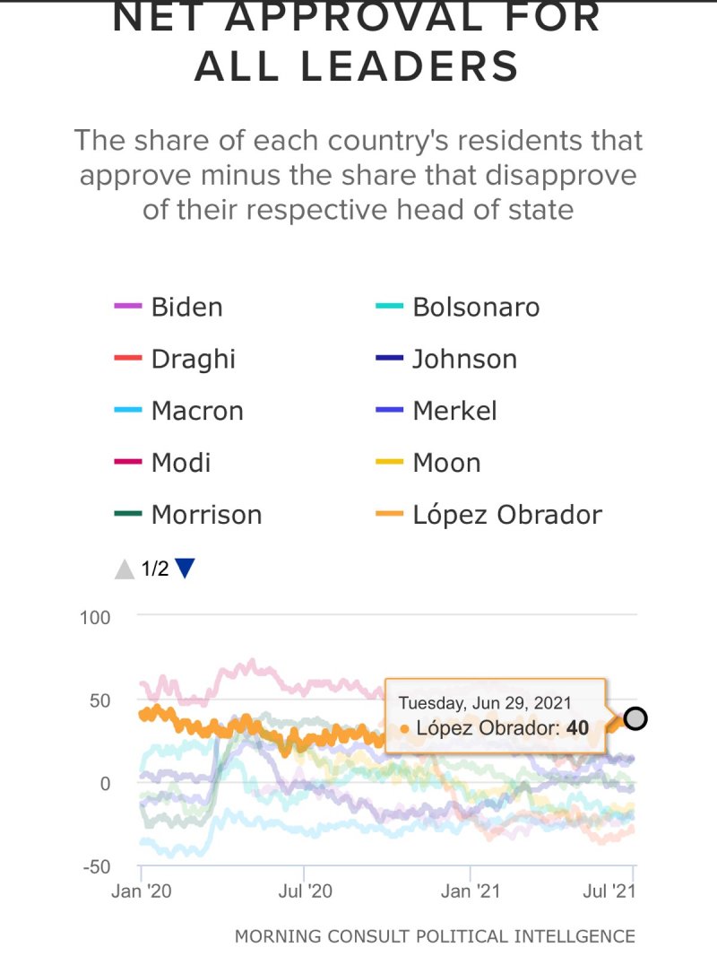 La consultoría estadounidense Morning Consult, que proporciona datos de encuestas en tiempo real sobre elecciones y funcionarios electos, asegura que, en su más reciente evaluación, Andrés Manuel López Obrador resultó ser es el presidente más popular.