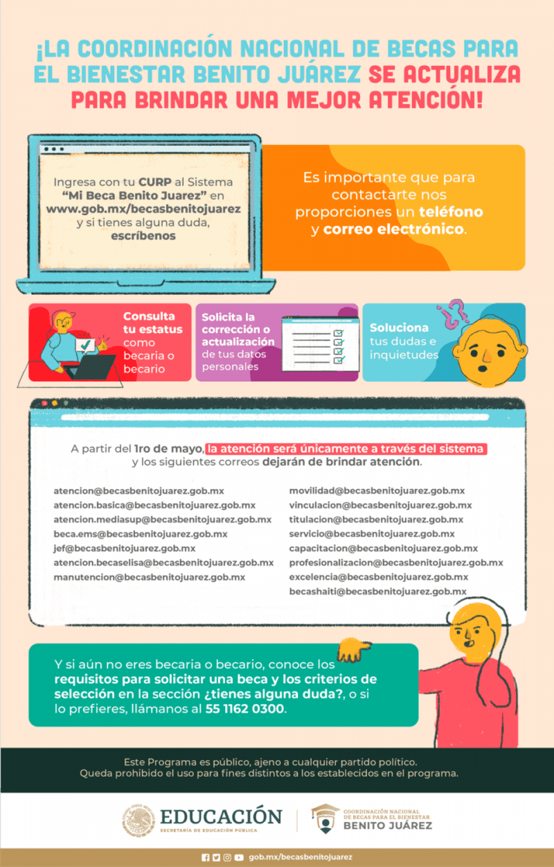 Por último se puede realizar la petición por medio de correo electrónico a las direcciones: atencion@becasbenitojuarez.gob.mx o personal.atencion.basica@becasbenitojuarez.gob.mx. Es importante proporcionar la información personal requerida.