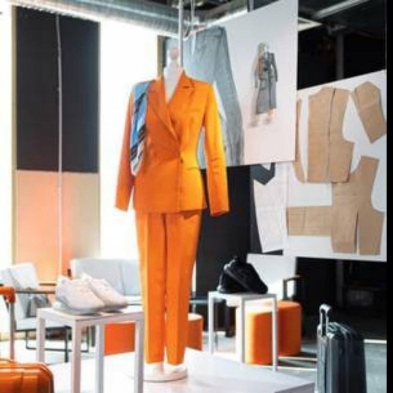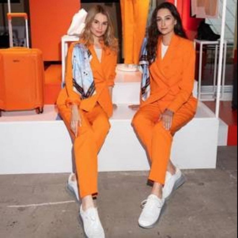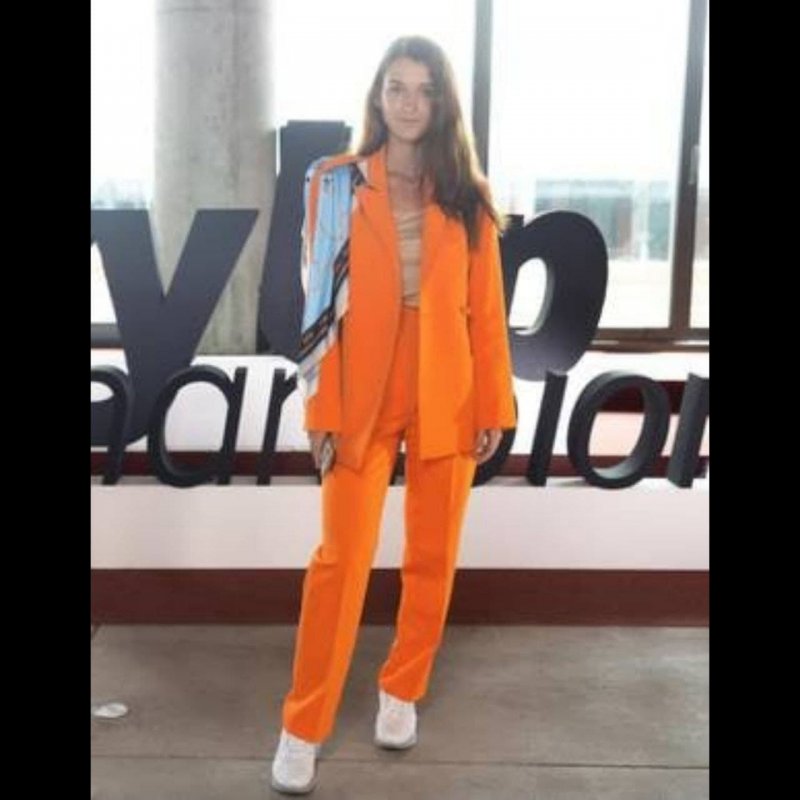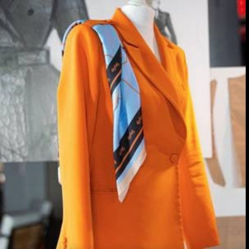 Se trata de unos tenis blancos y un traje holgado de dos piezas color mandarina, característico de la aerolínea, acompañado de un pañuelo de seda.