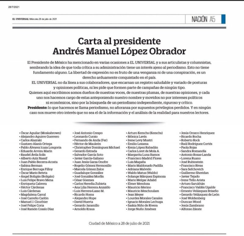 Pero con la carta, también queda claro que no todos los colaboradores del diario piensan igual. Plumas importantes como la de Lorenzo Meyer no firmaron la carta.