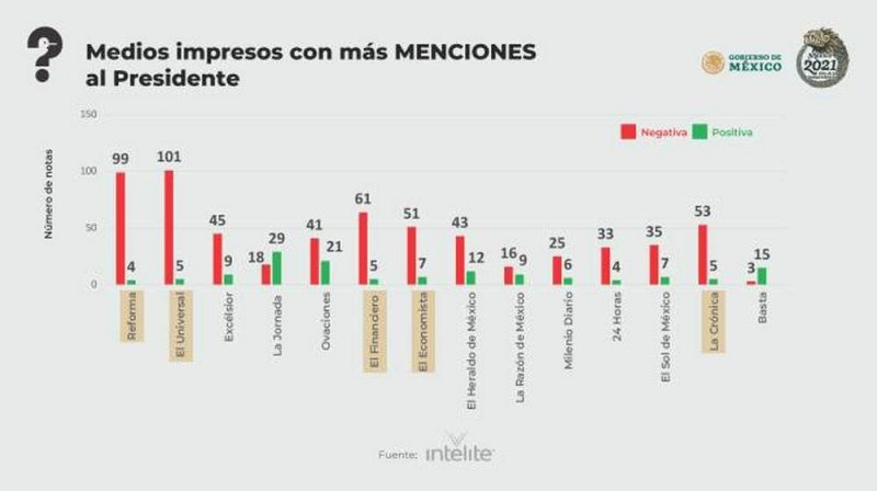 El mandatario mostró cuántas notas publica cada uno a favor y en contra de su gobierno. El resto de los colaboradores de El Universal parece que asume que ellos también se encuentran en la misma posición, ya que no han sido mencionados.