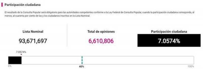 Al corte de las 7:04 horas del 2 de agosto, en INE ha informado que la participación fue del 7.05% y se han computado 56 mil 355 actas de un total de 57 mil 77, es decir, el 98,73%.