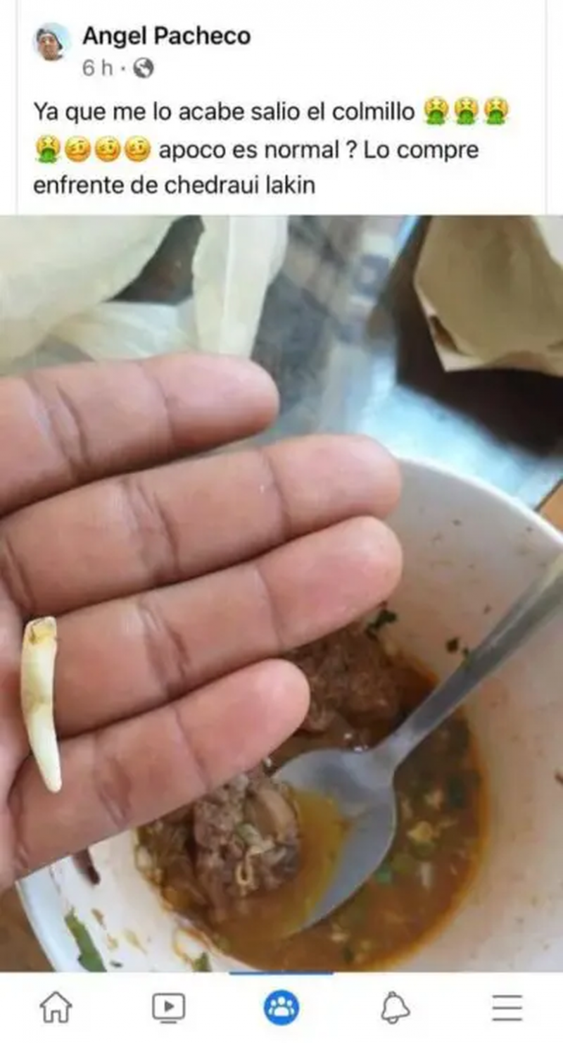 El individuo, identificado como Angel Pacheco, acompaña su fotografía con un mensaje donde señala: “Ya que lo acabe salió el colmillo…”, y agrega la pregunta: a poco es normal?, refiriendo que compró esos alimentos en un local enfrente del autoservicio Chedraui de la avenida Lakín.