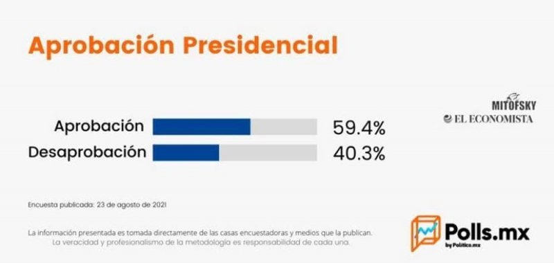 De acuerdo con el ejercicio realizado, en conjunto, por El Economista, un diario que se ha caracterizado por su actitud crítica al gobierno federal y Consulta Mitofsky, la aprobación de AMLO está en 59.4%, poco más de tres puntos arriba de la medición registrada el mes pasado, que fue de 56.2%.