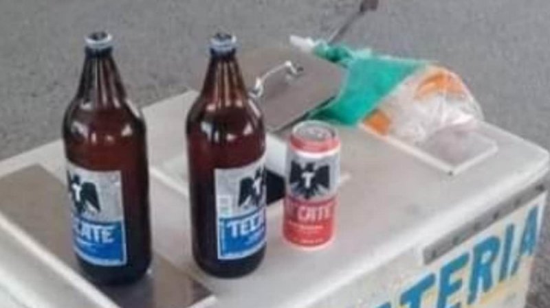 Entre las bebidas alcohólicas escondidas en el carrito de paletas estaban dos caguamas de la marca Tecate y una cerveza en lata con etiqueta roja de la misma compañía cervecera.