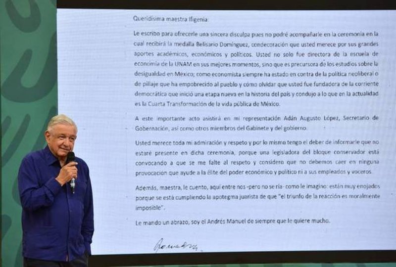 Así lo aseguró López Obrador al revelar una carta que envió a Ifigenia Martínez, en la que le explicó a la activista la razón por la cual había tomado la decisión de no acudir a la ceremonia.
