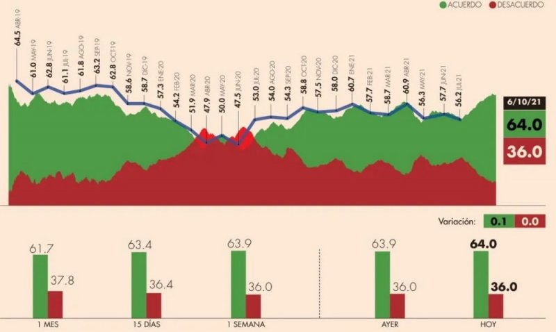 Ayer la cifra rondaba los 63.9 puntos, mientras que la semana pasada fue la misma cantidad, lo que significa que López Obrador tiene el mayor apoyo.