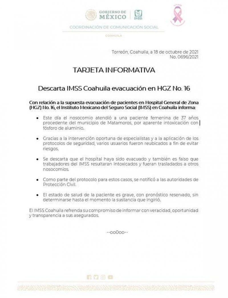 Tras volverse viral la noticia de una mujer que ingresó a la Clínica 16 del IMSS en Torreón desprendiendo gases tóxicos de su cuerpo, el Instituto aclaró varios puntos en un comunicado.
