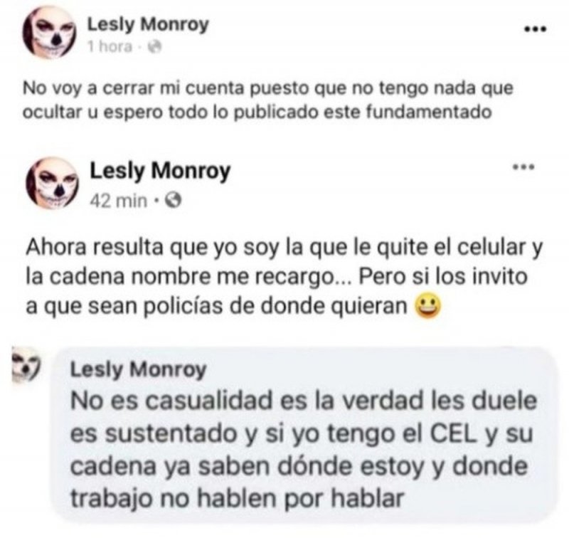 “Ahora resulta que yo soy la que le quité el celular y la cadena, nombre me recargo... Pero sí los invito a que sean policías de donde quieran”, añadió en otra publicación.