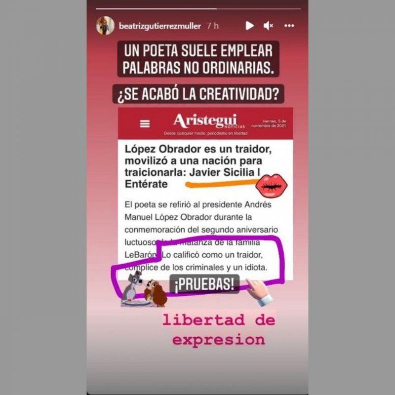 Fue por medio de una storie en su cuenta de Instagram que la primera dama criticó a Javier Sicilia de “ordinario”.