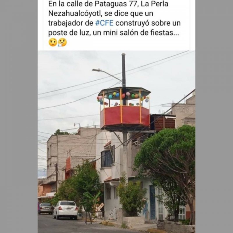 Un trabajador de la CFE hizo un “saloncito de fiestas” en un poste de luz, acusan usuarios de redes sociales. Se presume que el salón de fiestas irregular está en Nezahualcóyotl, Edomex.