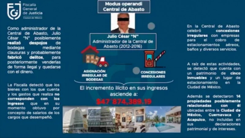 El tercer modus operandi fue desde la Central de Abasto que operaba Julio César N, ex jefe de gabinete de Miguel Ángel Mancera, en donde “posiblemente realizó despojo de bodegas mediante clausuras y posiblemente fabricó delitos para posteriormente venderlas de forma ilegal y quedarse con el dinero”.