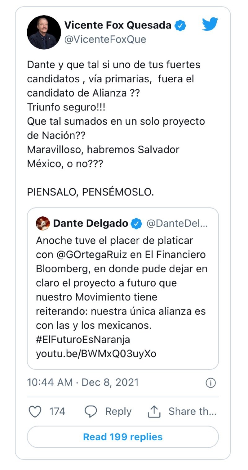 A través de las redes sociales, el expresidente Vicente Fox planteó al coordinador nacional de Movimiento Ciudadano, Dante Delgado, entablar una alianza rumbo a las elecciones de 2024. Propuso que el candidato que surja de las primarias del partido naranja, ya fortalecido, esté al frente de una alianza lo cual considera que sería “triunfo seguro”.
