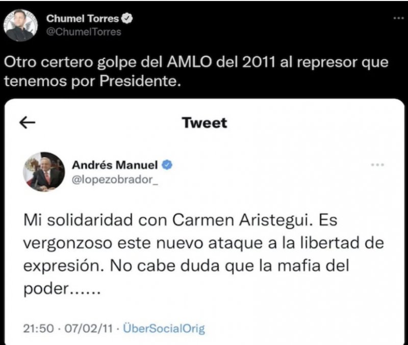 A través de su cuenta de Twitter, Chumel escribió “Otro certero golpe del AMLO del 2011 al represor que tenemos por Presidente”, adjuntando una captura de imagen de un tuit de AMLO que data del 07 de febrero de dicho año, el cual dice: