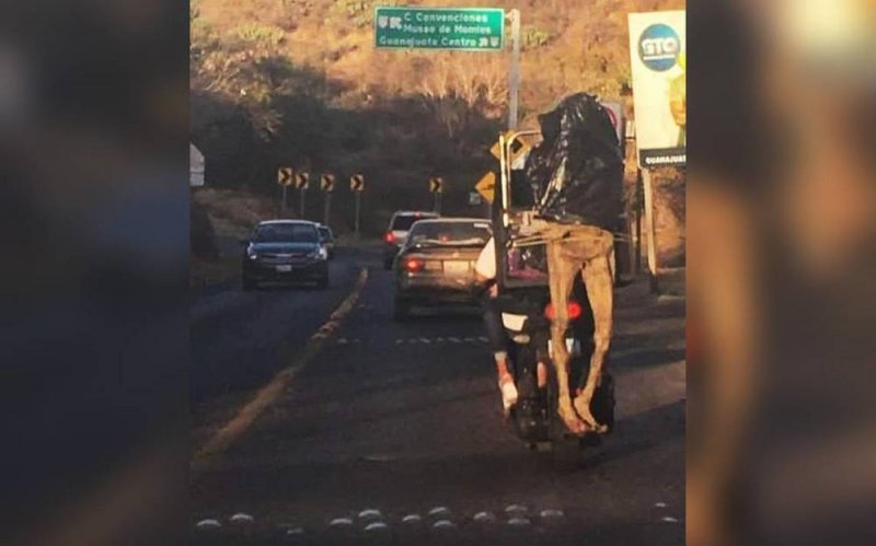Un hombre viajaba en una motocicleta y entre los objetos que cargaba había una momia, pero la mitad de su cuerpo estaba cubierto con una bolsa negra y solo se ve de la cadera hacia abajo.