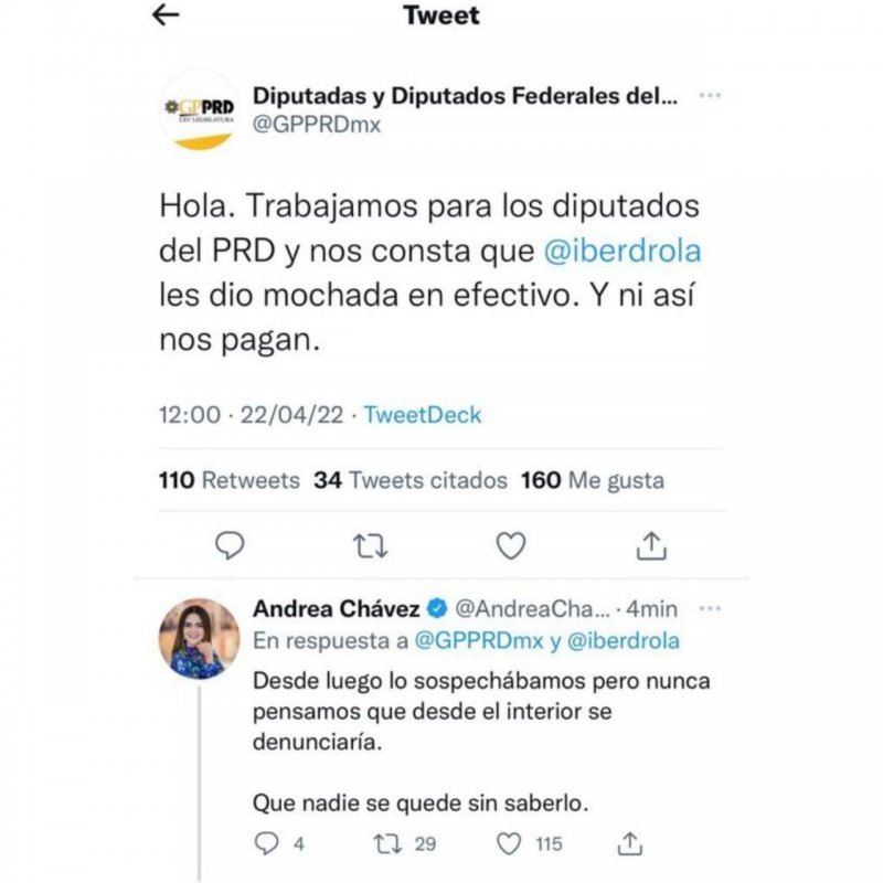 Vía Twitter, el equipo de redes del PRD acusó falta de pago. Por ello revelaron que las y los legisladores del PRD recibieron sobornos por parte de la empresa española Iberdrola. Según la cuenta de los diputados, los “moches” habrían sido entregados en efectivo.