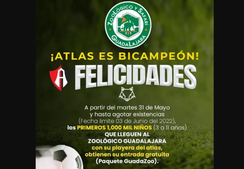 "Los esperamos a partir de mañana martes 31 de mayo desde las 10:00am, los 1,000 primeros niños (3 a 11 años) que lleguen al Zoológico Guadalajara con su playera del Atlas FC entran Gratis (Paquete Guadazoo)", señaló el Zoológico en sus redes sociales.