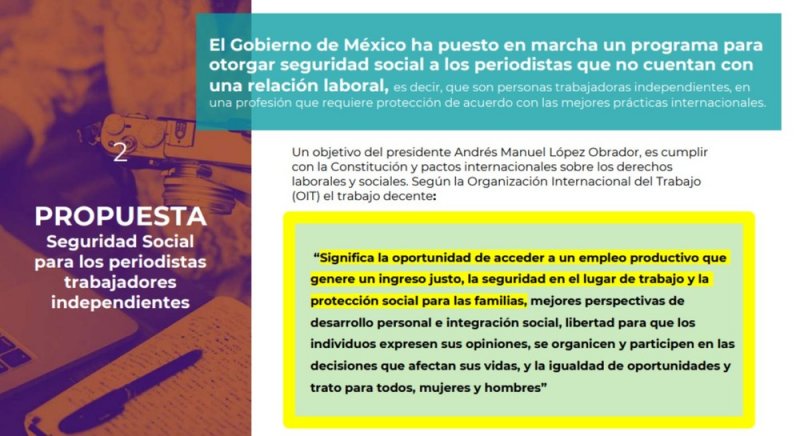 El Presidente Andrés Manuel López Obrador anunció el día de hoy el plan de Seguridad Social para Periodistas por Cuenta Propia cuyo registro inicia este martes y dará prestaciones a los periodistas independientes con una equivalencia de 2 mil 139 pesos mensuales. El Infonavit también presentará un programa de vivienda para los miembros del gremio.