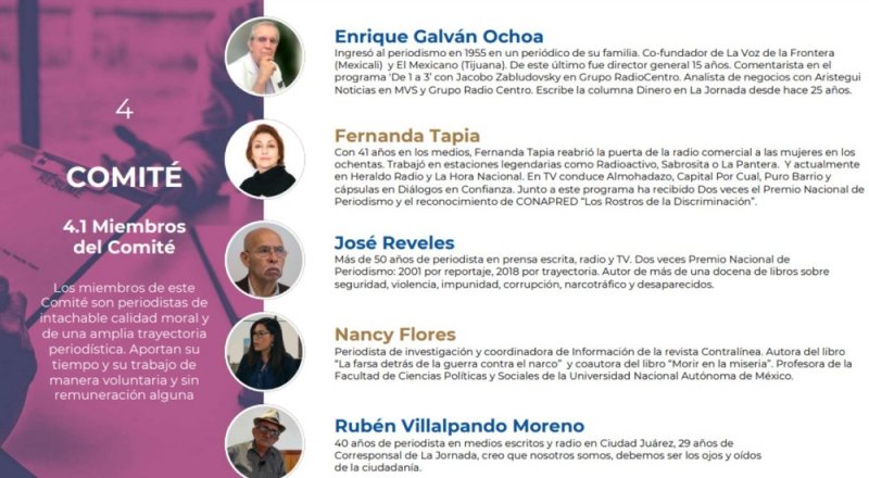 Los periodistas que integrarán este comité son, Enrique Galván Ochoa, Fernanda Tapia, José Reveles, Nancy Flores, Rubén Villalpando Moreno. Todos ellos, son periodistas con más de 15 años de trayectoria en diferentes medios.
