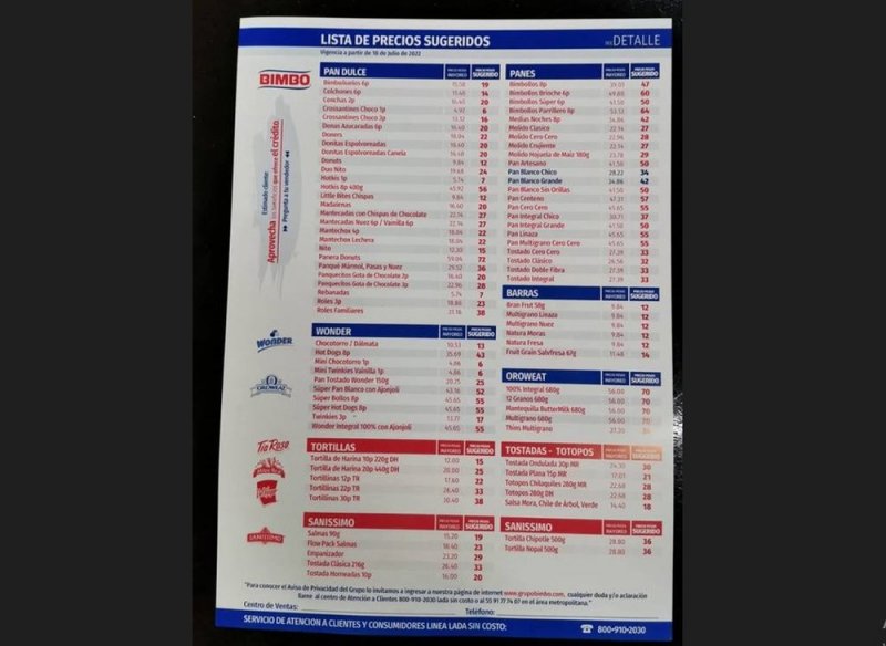De acuerdo con la nueva tabla de precios sugeridos, esto valdrán los panes y productos de marcas como Bimbo, Wonder y Tía Rosa a partir del lunes 18 de julio.