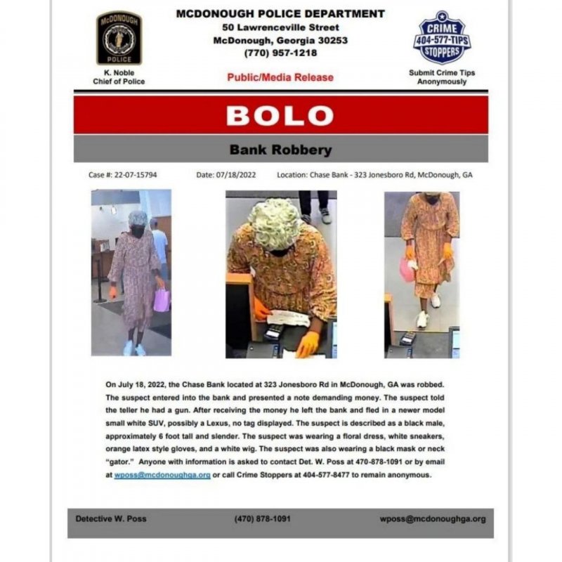 Recientemente, la policía del condado de McDonough en Georgia, Estados Unidos, dio a conocer que se encuentran buscando a un hombre que robó un banco disfrazado de abuelita el pasado lunes 18 de julio, pues logró salirse con la suya y huyó con todo el dinero.