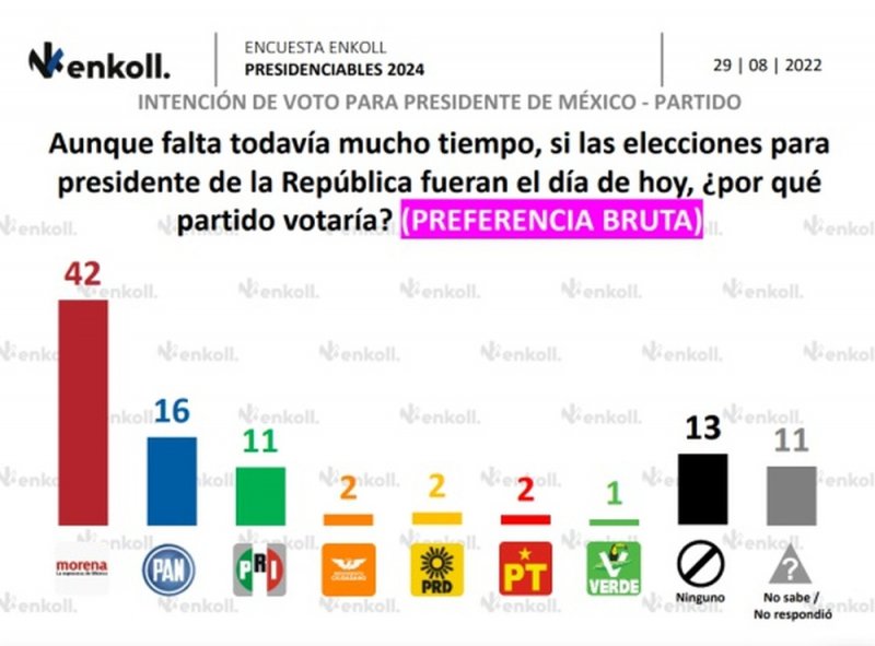 En contra partida, Morena suma 22% del público que no votaría por este partido. En tanto que un 15% manifestó su rechazo al Partido Acción Nacional (PAN).
