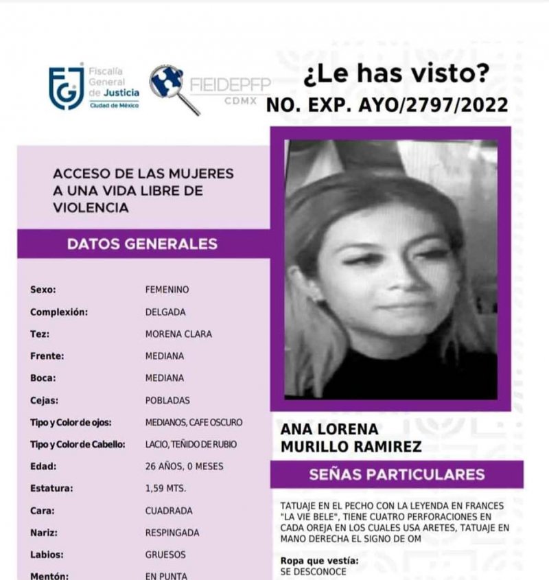 Como señas particulares, la joven de 26 años tiene un tatuaje en el pecho con la leyenda en francés “la vie bele"; también tiene cuatro perforaciones en la oreja y un tatuaje en la mano derecha con el signo de "OM".