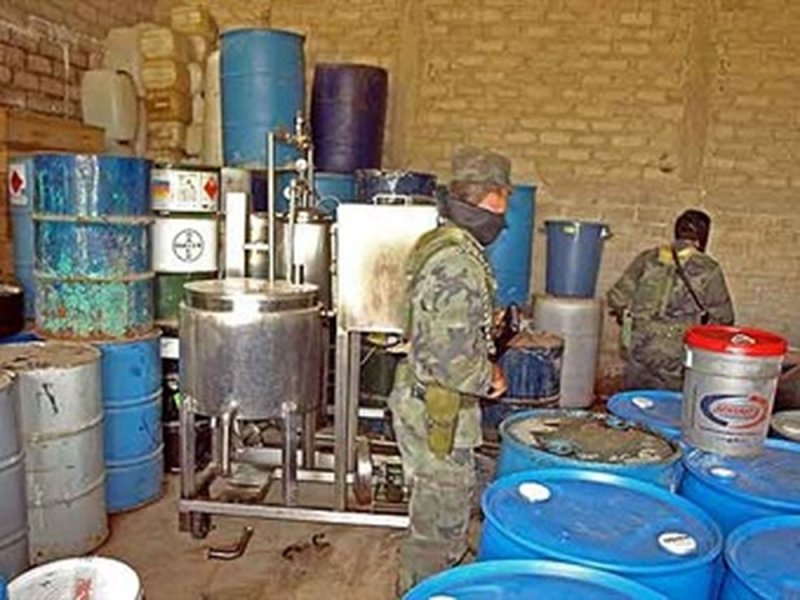 Ya con la autorización para la diligencia fue revisado el domicilio en el que fueron decomisados tres tambos que contenían ácido clorhídrico y tolueno, dos bolsas de plástico con aproximadamente 350 gramos de metanfetamina y otros recipientes metálico que contenían residuos sólidos cristalinos, además de un condensador de metal.