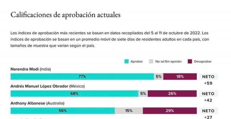 Asimismo destacó que en la encuesta de aceptación de mandatarios del mundo, hecha por la empresa Morning Consult, su popularidad sigue superando el 60%, en segundo lugar por debajo de Narendra Modi, primer ministro de la India.