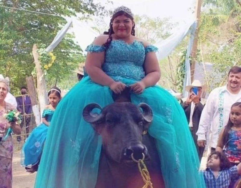 En la imagen, se puede ver a la festejada con un largo y brillante vestido azul, portar una corona de plata y sonreír tanto por la fotografía, como por lo feliz que se encontraba en su celebración, todo esto, mientras monta un búfalo que a su vez es jalado desde una argolla que tiene en su nariz.