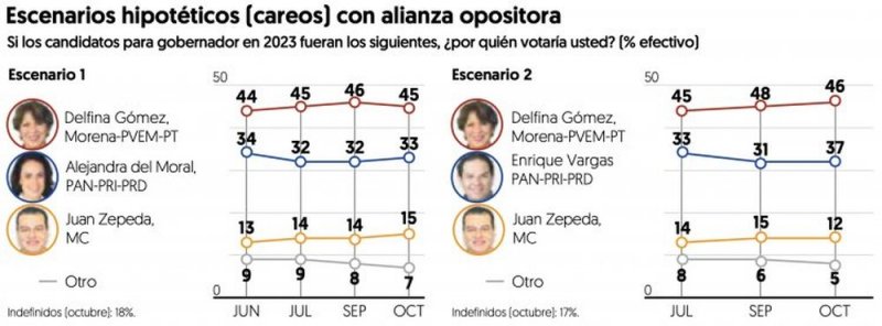 Sin embargo, la definición del candidato será crucial porque en careos, la 4T da la vuelta a la alianza opositora y Delfina Gómez, virtual candidata de Morena, saca ventaja de 12 puntos.