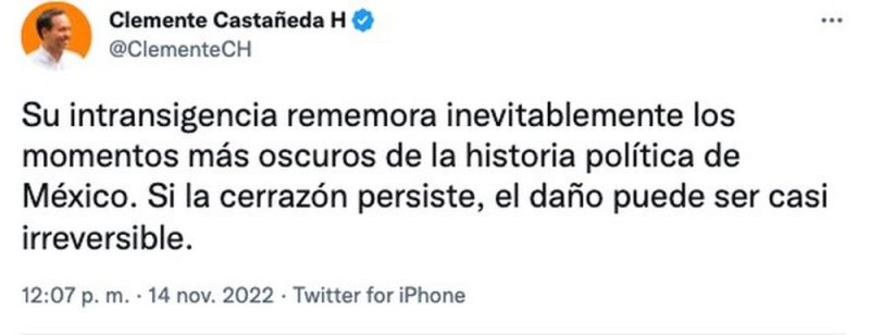 Esto debido a que AMLO descalificó a miles de personas que asistieron a la marcha en defensa del INE y en defensa de la democracia en todo México. Afirmó que con su intransigencia “rememora inevitablemente los momentos más negros de la historia política de México”.