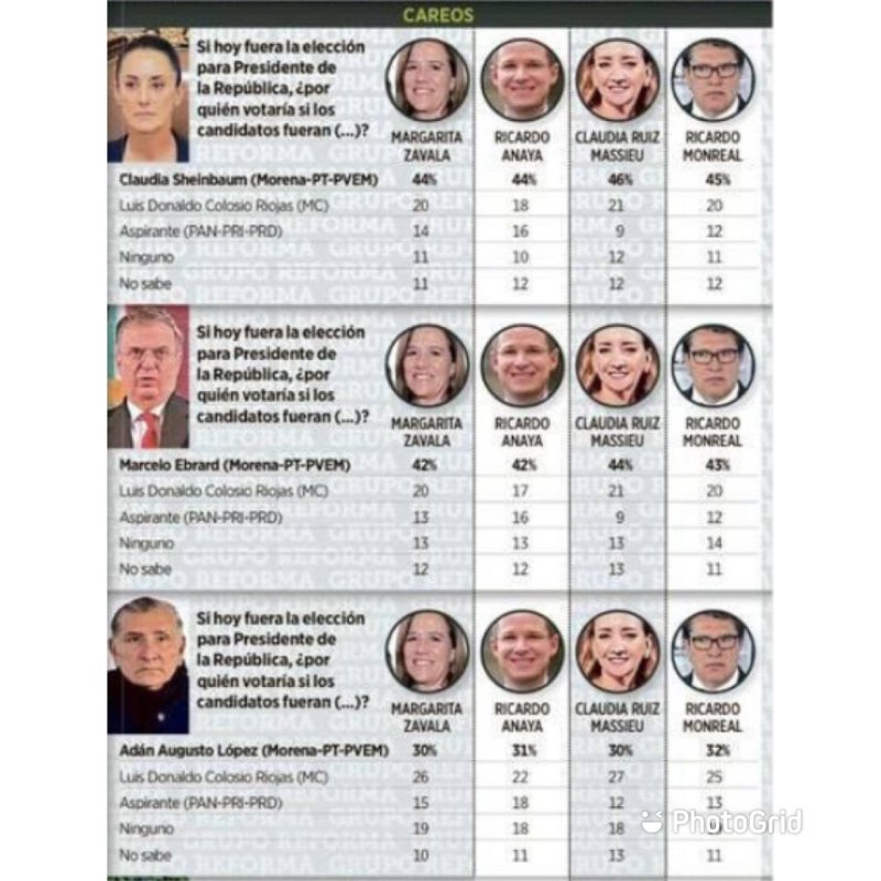De acuerdo con Reforma, al interior de Va por México se atomizan las opciones, sin que exista una figura relevante hasta el momento; en los careos los personajes que podrían competir serían la diputada del PAN, Margarita Zavala; el excandidato Ricardo Anaya; la senadora Claudia Ruiz Massieu, e incluso el líder de Morena en el Senado, Ricardo Monreal; sin embargo ninguno se muestra competitivo ante el partido de la 4T.