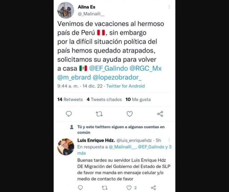 Por la mañana de este miércoles Alina Esparza compartió un tweet pidiendo ayuda al gobernador del estado, Ricardo Gallardo; al alcalde capitalino, Enrique Galindo; así como al canciller Marcelo Ebrard y al presidente Andrés Manuel López Obrador, pues ella junto con su pareja se encuentran varados en Perú tras las protestas y bloqueos en aquel país.