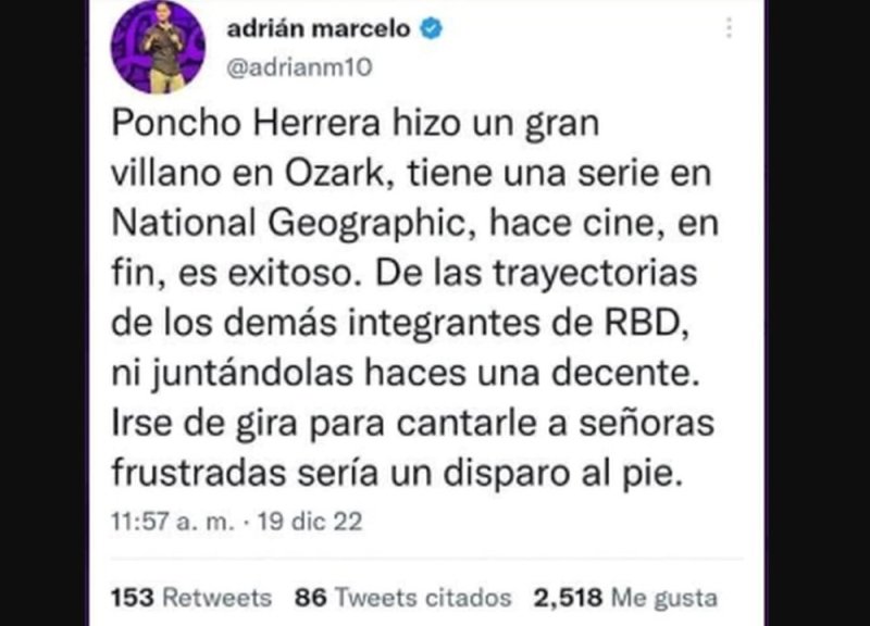 Además, el tuit de Adrián Marcelo fue borrado de su cuenta, por lo que no tuvo relevancia y menos para los fans de RBD.