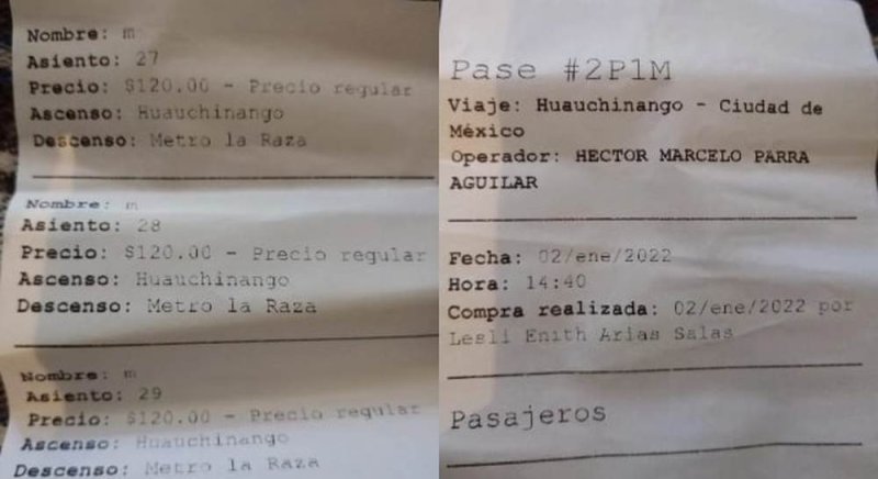 En redes sociales se compartieron los tickets de los boletos y así fue como se supo que el operador de la unidad era Héctor Marcelo Parra Aguilar, quien realizó el viaje el pasado 2 de enero e inició el recorrido a las 14:40 horas, el cual concluyó casi a las 10:30 de la noche.