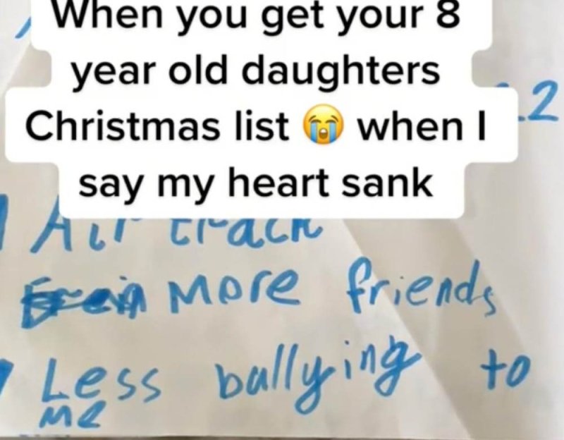 La niña pidió a Santa Claus que le hicieran menos bullying y también más amigos, algo que destrozó a la madre Suzy emocionalmente al darse cuenta que su hija no la pasaba nada bien en su escuela.